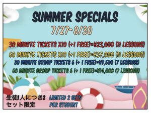 お知らせ 2025/07/30 Summer Specials!! 超お得なレッスンチケット!!この機会にぜひ!! ACE英会話スクールではSummer Specialsを実施中です! チケットをお得なプライスで販売しております。 詳しくはお問合せ下さい♪ ※チケットに有効期限はありません!