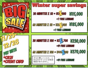 お知らせWinter super savingss!! 2025/11/25 Winter super savings!! 開催期間:2025/11/25~2025/12/28 期間限定!超お得なレッスンチケット!!この機会にぜひ! ACE英会話スクールではWinter super savingss!を実施中です! チケットをお得なプライスで販売しております。 詳しくはお問合せ下さい♪